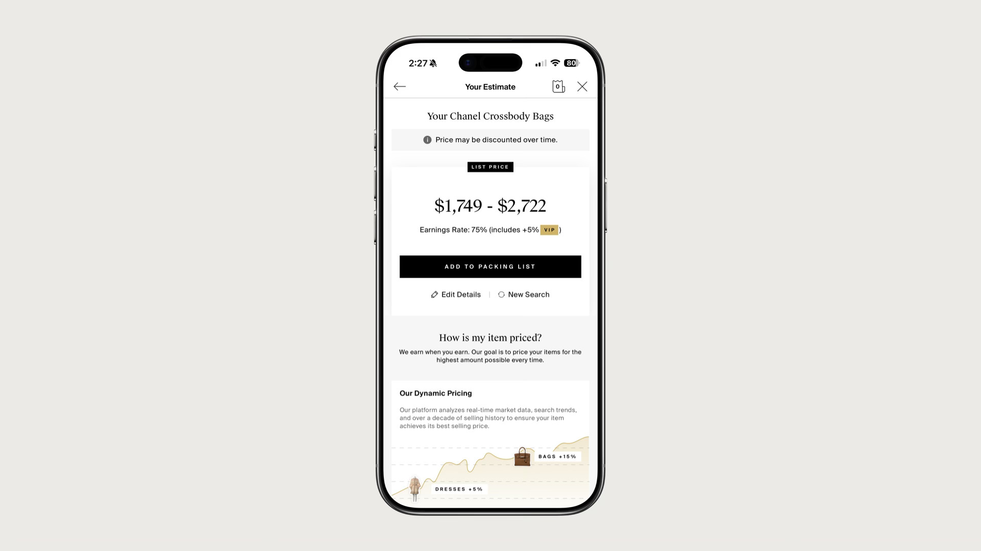 Dynamic price and earnings estimator for customers and sales reps to understand the value of luxury items on TRR